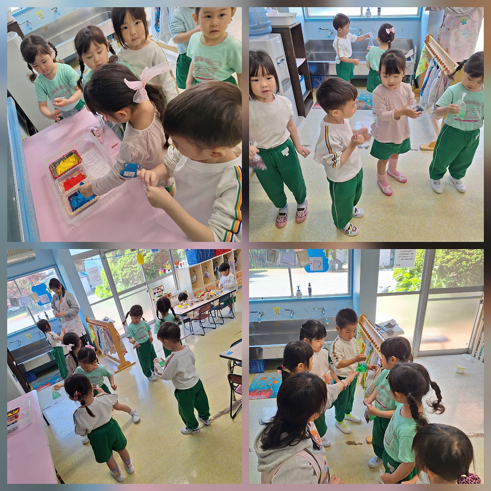 ビニール袋にクレープ紙を入れ、色水遊びをしました。